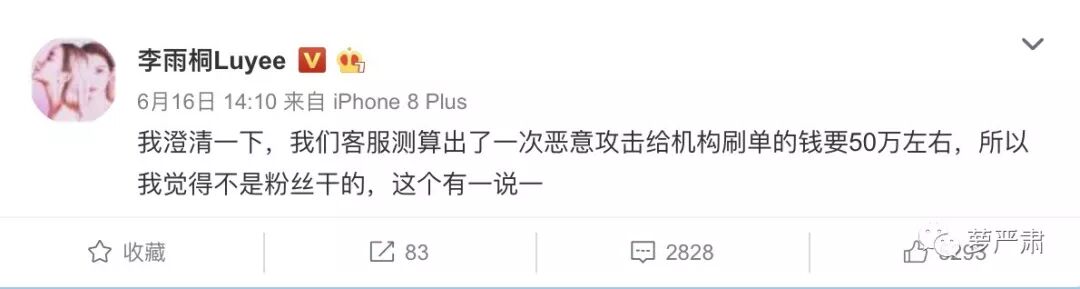 但李雨桐说“我觉得不是粉丝干的”,因为恶意刷单攻击的成本很高,一次就要50万。