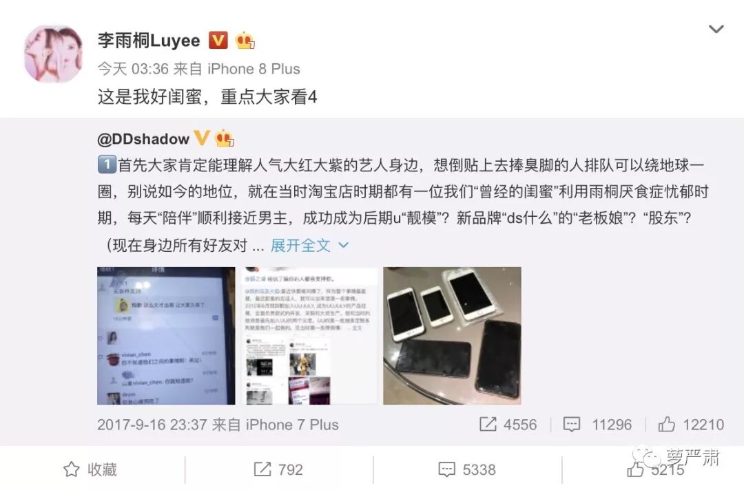 还有一个料是李雨桐从去年的大混战里翻出来的,她转发自己闺蜜@DDshadow 去年的微博,划重点让大家看其中一段。