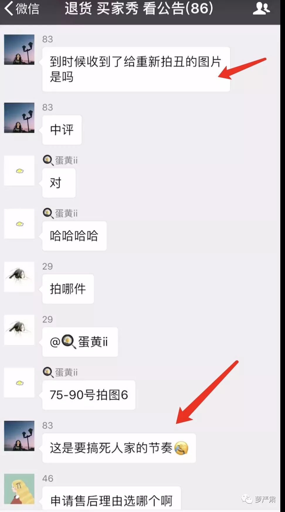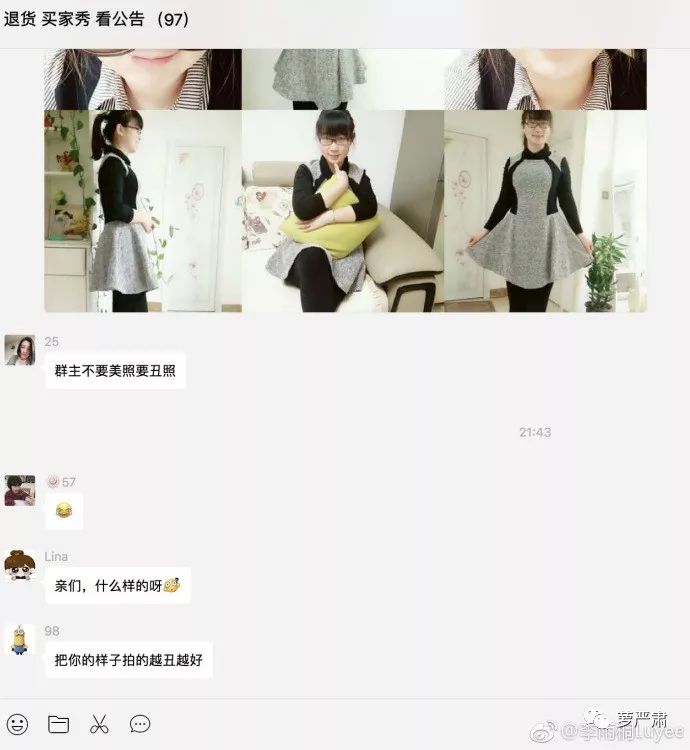 还有这种,“群主不要美照要丑照”,要求收到货的尽量拍丑发到李雨桐店铺的买家秀。