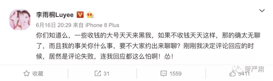 刺激李雨桐爆料的第二个因素,她说老有大号黑自己,她自己想去评论回复的时候就会发现评论失败。