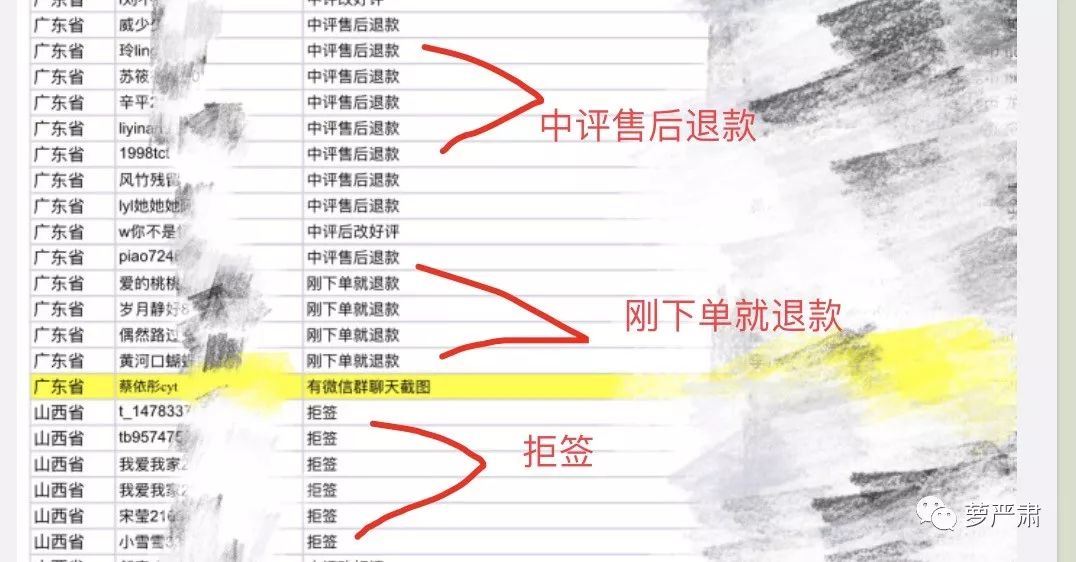 李雨桐还说:普通的不合适退款跟这种恶意的是可以分辨的。她做了个表格统计,除了有些退款的能拿出“组织退款”的微信群聊天记录之外,有相当部分是直接拒签、刚下单就退款、中评售后退款的。