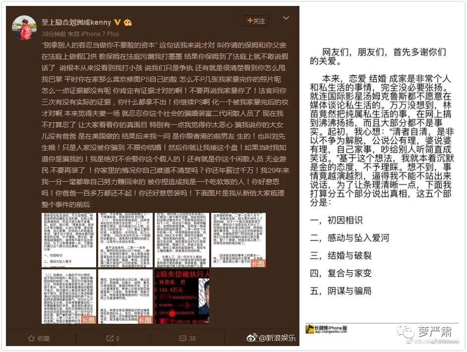 去年9月,曾经被妻子曝光“家暴”的至上励合成员刘洲成发长文,按章节来详细叙述自己的家事狗血,说自己被骗婚了。