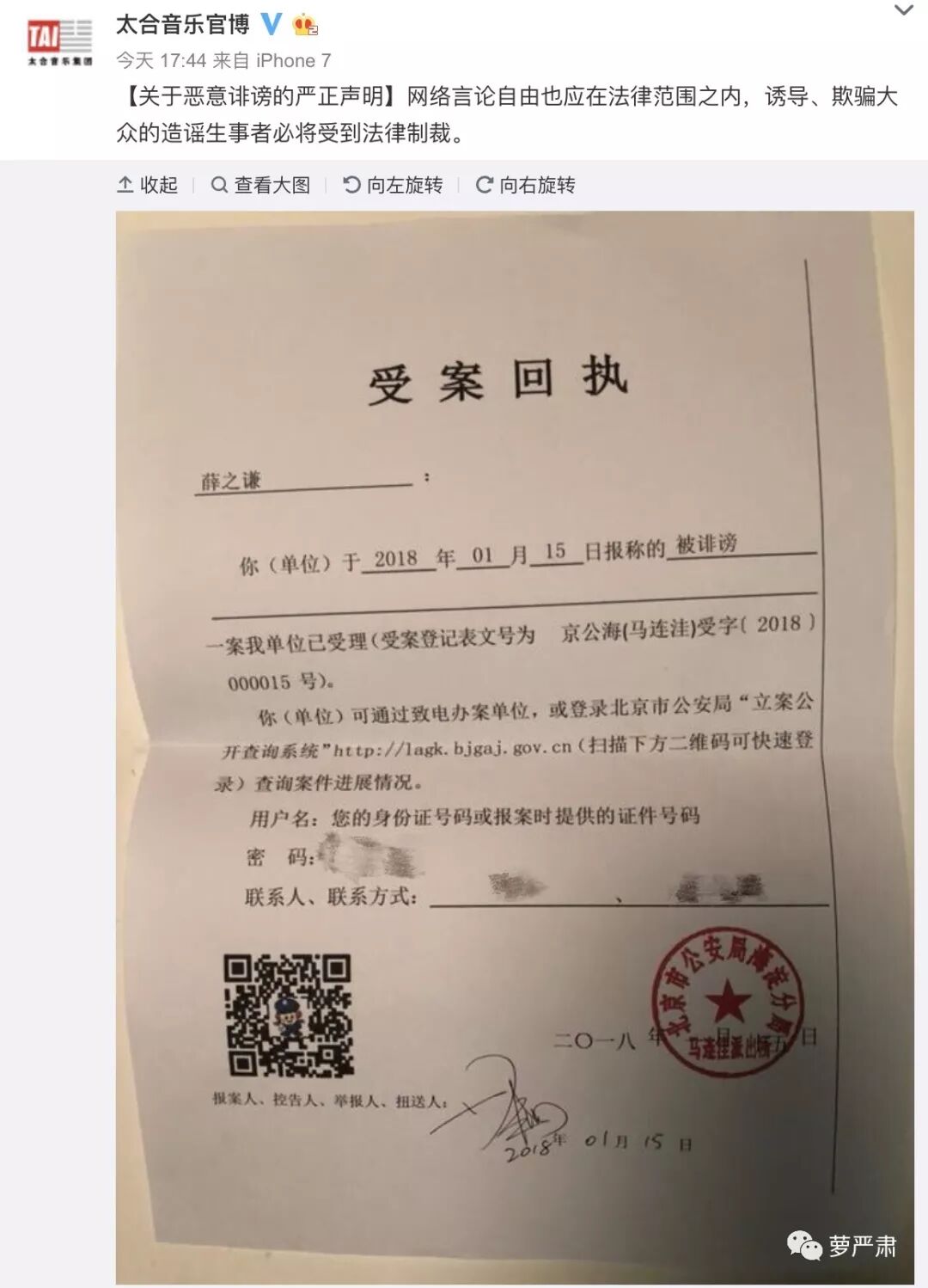 薛之谦所在的太合音乐官博发声了,晒了个受案回执,薛之谦已经去报案自己被诽谤了。