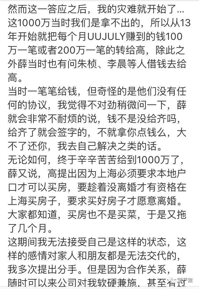 2.薛之谦跟高磊鑫谈离婚是千万级别的赔偿,跟女友谈分手是百万级别的赔偿。总之他咣咣咣为了狗屁倒灶的感情往外掏钱。前几年还老在微博上媒体上哭做音乐费钱。