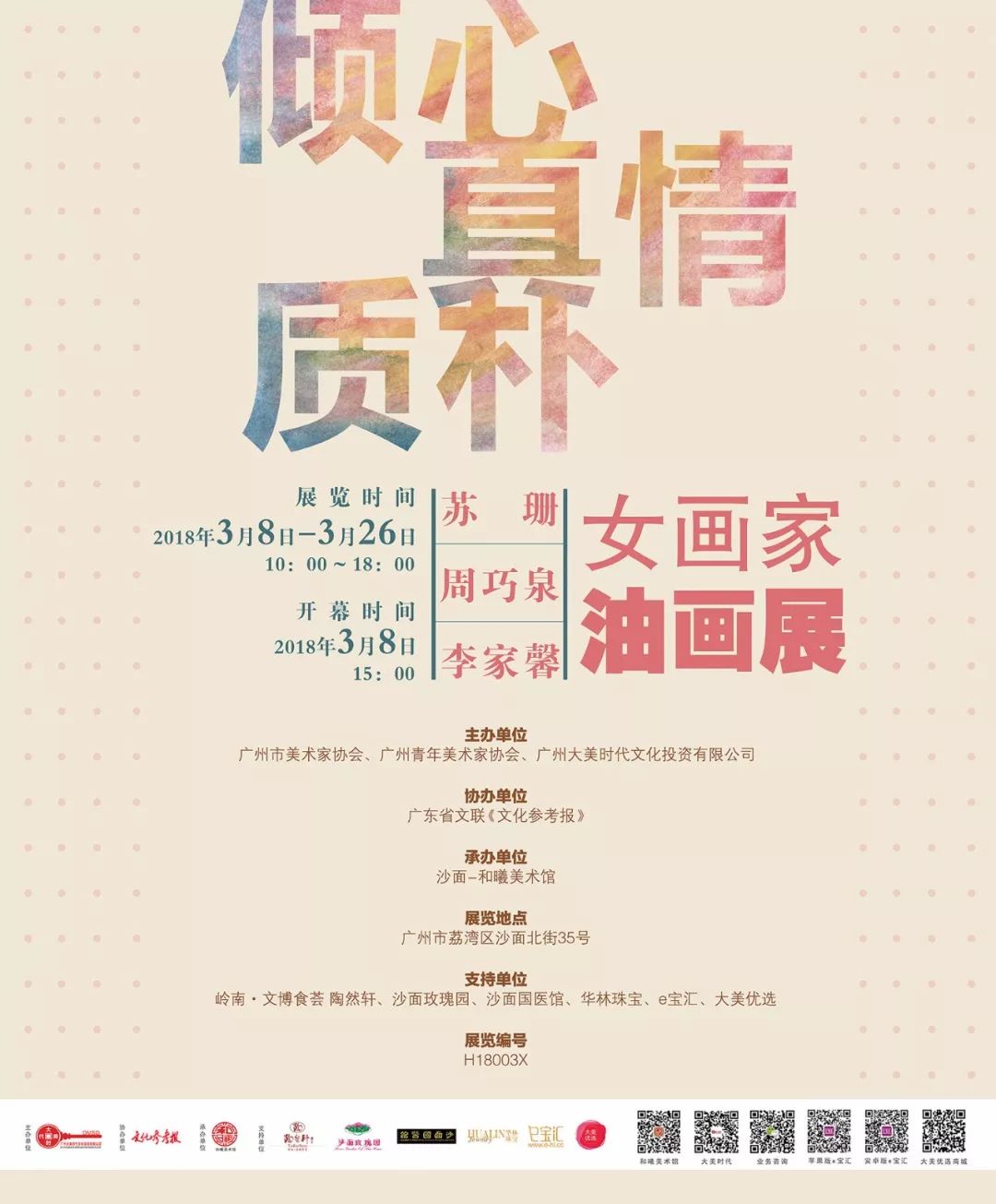 三月阳春,丹花烂漫,“倾心 •真情 •质朴 — 苏珊 、周巧泉、李家馨油画展”在历尽沧桑的沙面,于和曦美术馆展出。三位油画女将,不同风格、语言、题材、追求,既相互碰撞又有共同点的女油画家的油画语言。传递出她们对油画抱有真诚、真挚、炽热的情感。