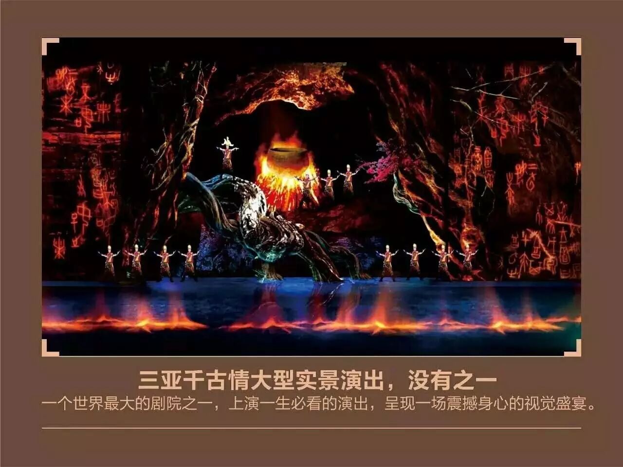 【三亚千古情】:海南省唯一获得"五个一工程"奖的旅游演艺作品,演绎了三亚的历史和文化传奇。这里能听到落笔洞的万年回声,这里有巾帼英雄冼夫人的荡气回肠,这里有海上丝路的异域风情,这里能看到鉴真东渡时的惊涛骇浪,这里还有鹿回头的美丽传说。在椰风、海韵、沙滩的醉人风景中,感受三亚万年岁月的娓娓道来,寻一段浪漫邂逅。(赠送,行车约40分钟,游览不少于120分钟)