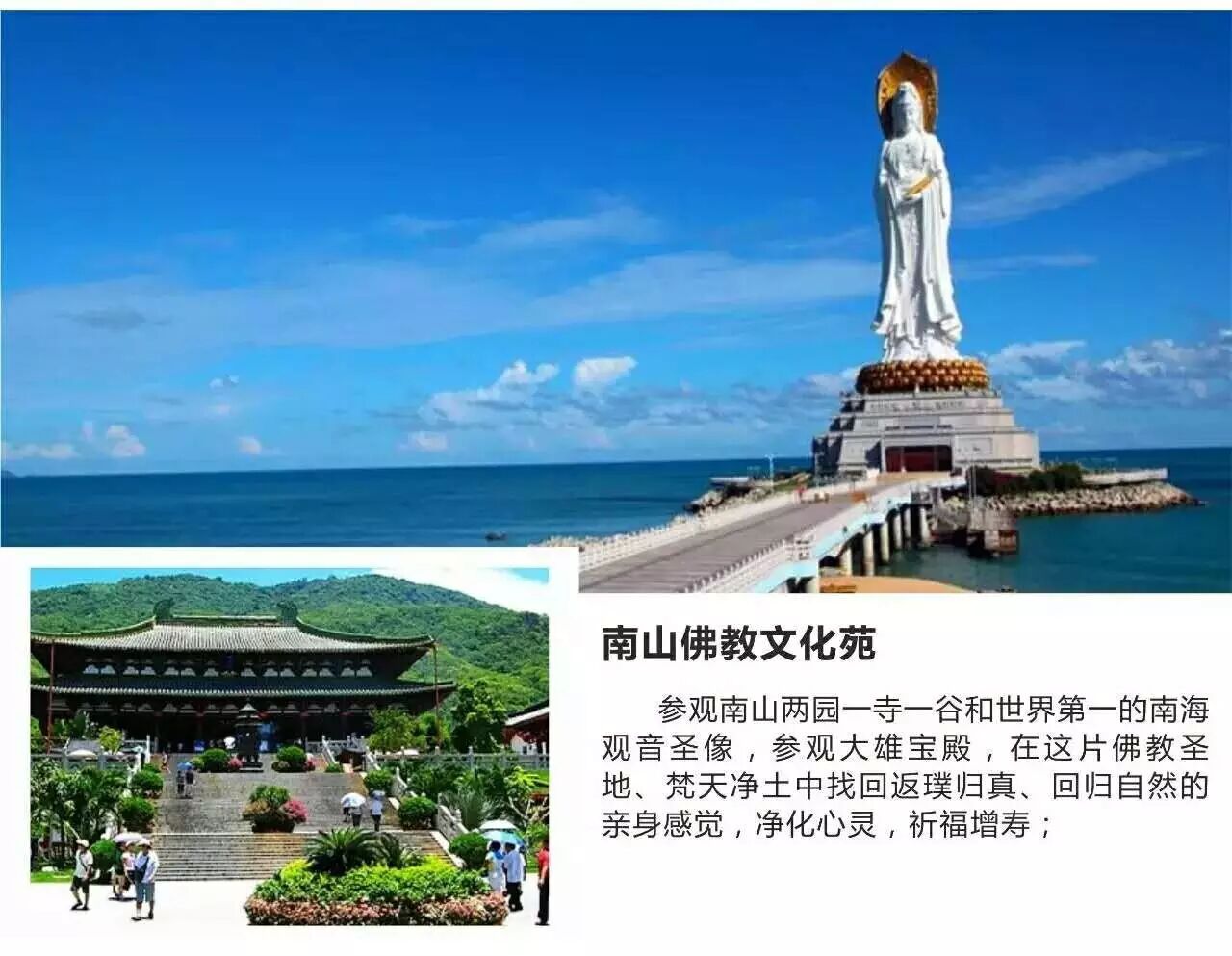 【南山佛教文化旅游区】:国家5A级景区、集园林生态文化、福寿养生文化、佛教文化于一体。多重文化相互辉映,相得益彰。膜拜世纪之作——海上108米的三面观音圣像。(行车约30分,游览不少于180分钟)