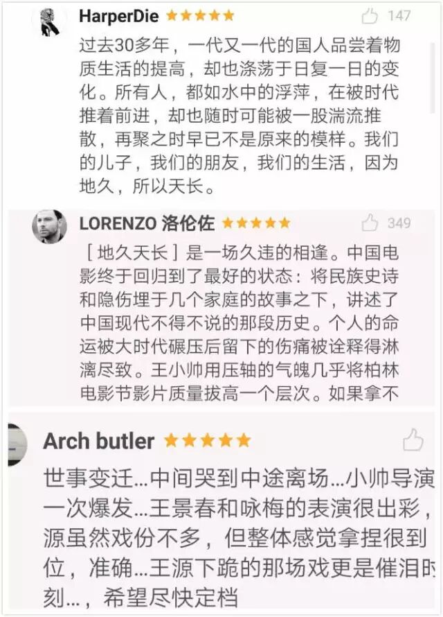 目前《地久天长》在豆瓣也是各种5星好评,一部分观众提前欣赏到了这部电影,“世事变迁...中间哭到中途离场”,“中国电影终于回归到了最好的状态”,“王源的几场戏真的令人惊喜!几十年的社会变迁真的没那么简单,预定金熊”。