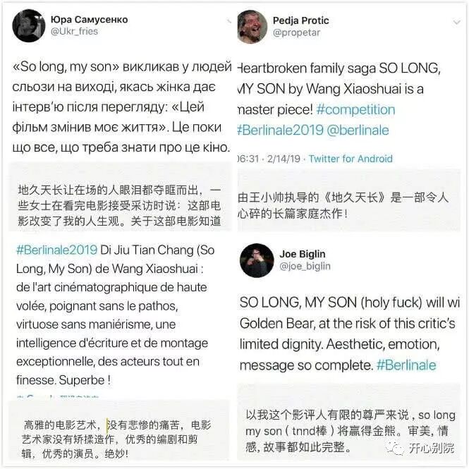 《地久天长》在柏林电影节完成了首秀,收获了一众好评。国外的观众们各种夸,“这是一部令人心碎的长篇家庭杰作”,“地久天长让在场的人眼泪都夺眶而出”,“审美、情感、故事都如此完整”。