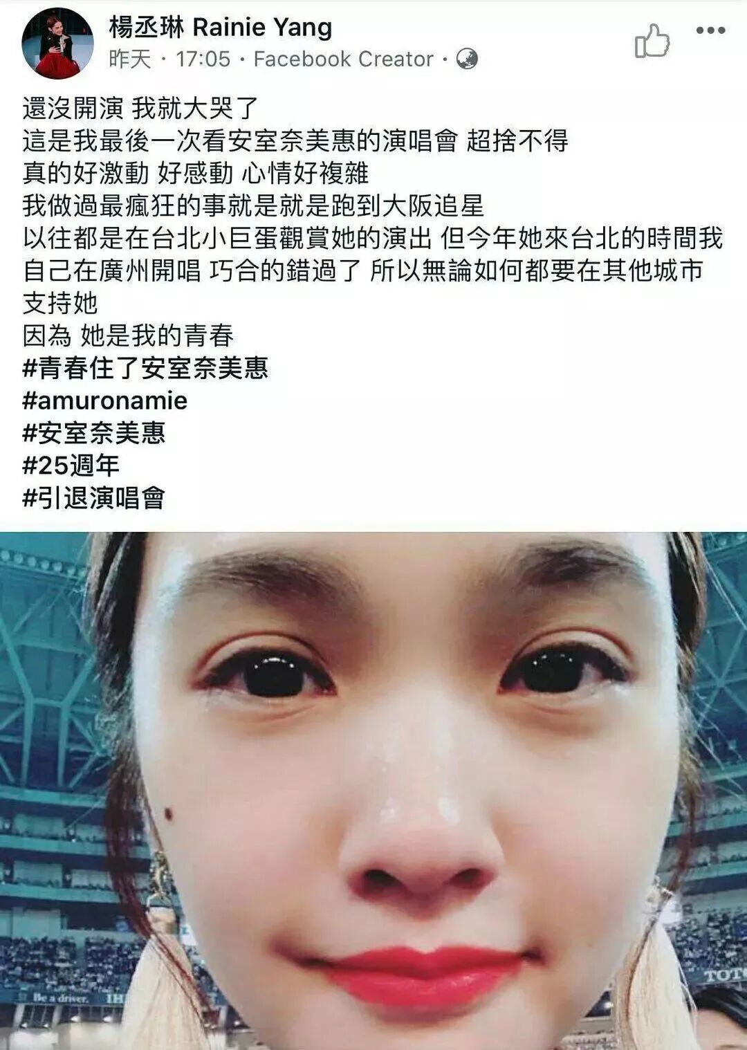 今天#杨丞琳 安室奈美惠#话题就这么上了微博热搜,原因是杨丞琳飞到日本大阪去看安室奈美惠的演唱会,甚至激动得在开唱前就直接大哭,把两眼都哭红了,并且在社交软件上发文,怀念自己的青春!