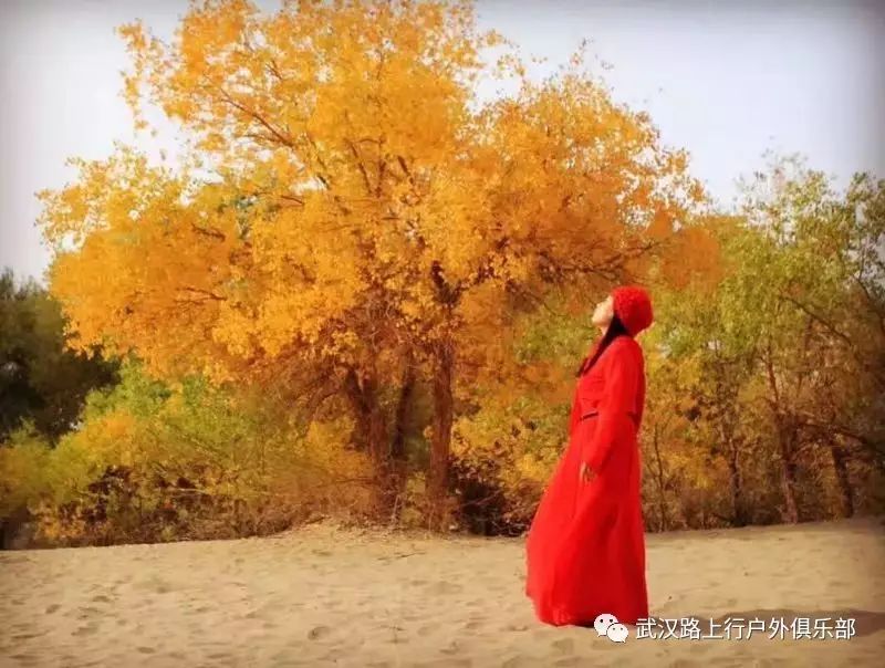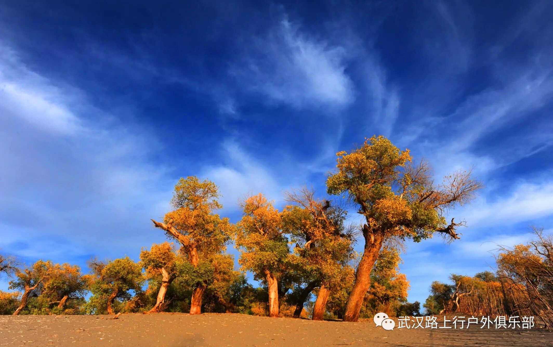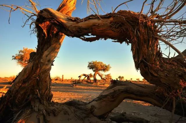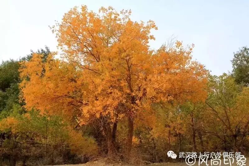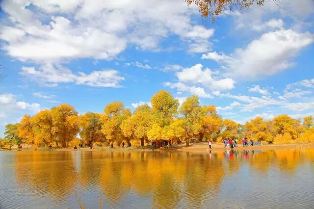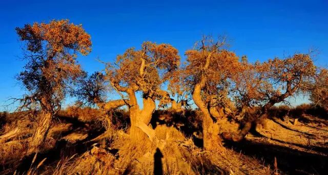 每年9、10月,当第一场秋霜,大片的胡杨树叶由绿变黄,一眼望去,阳光下金色的树叶衬着湛蓝的天空于风中婆娑起舞,那强烈的反差,鲜明的影调,亮丽的色彩,足以令任何语言文字显得苍白无力。