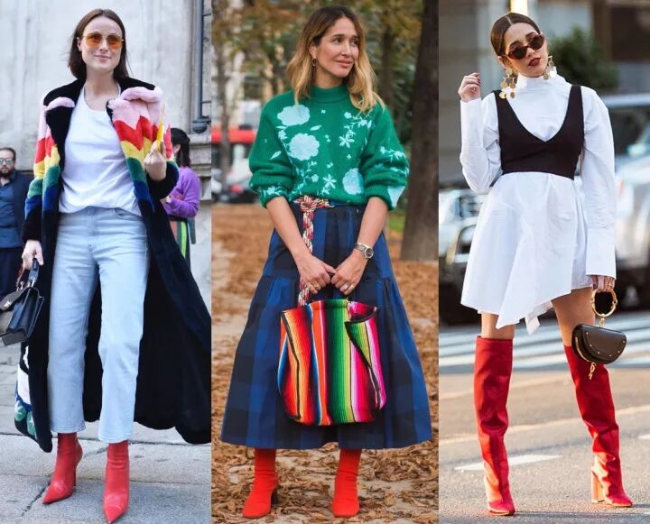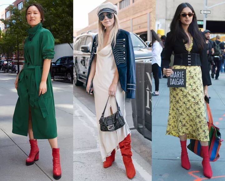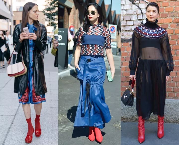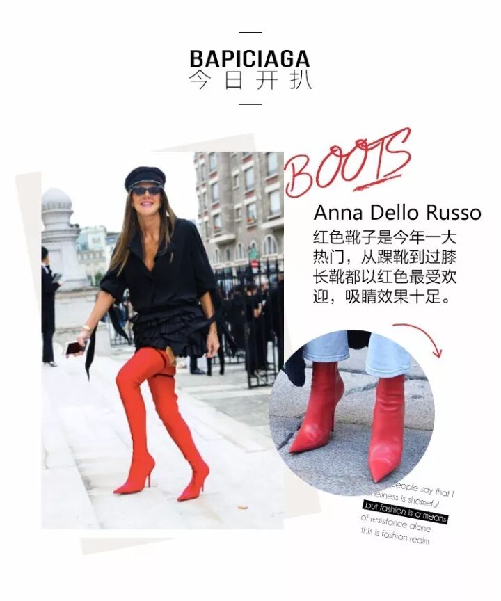 红色与靴子的设计相结合是今年最大的一个热门,不论是踝靴、过膝长靴还是袜靴,似乎总要是红色的才够酷。搭配上更是百无禁忌。