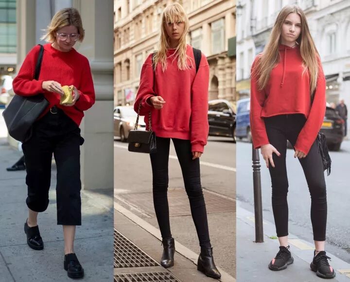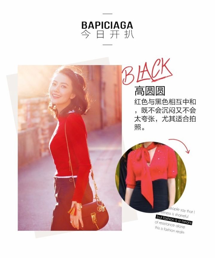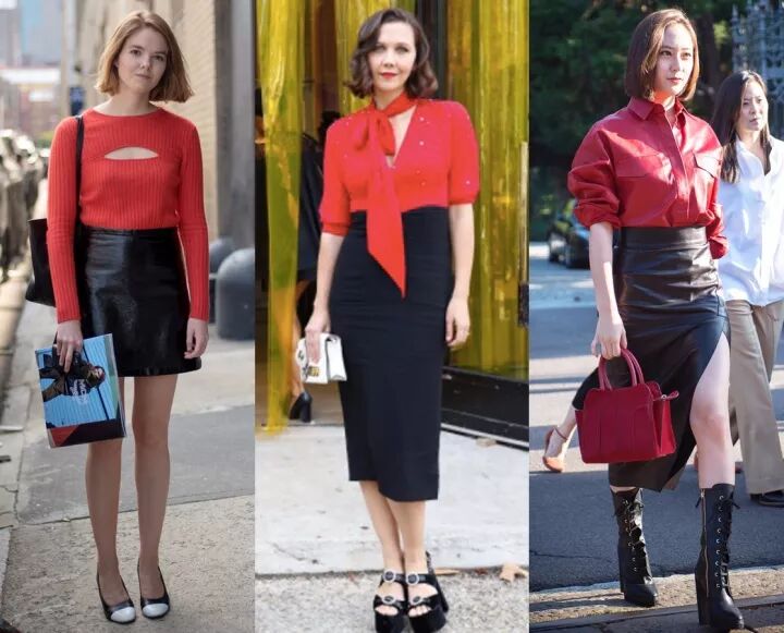 红色与黑色搭配是最简单不易出错的选择,尤其以红色上装+黑色下装的搭配最受欢迎。