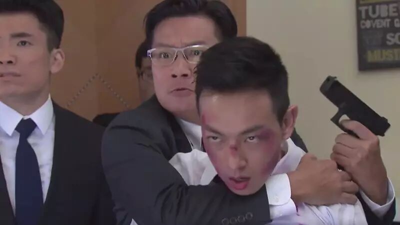 视频中看到,鲍起静饰演的大姐头令熊被盖上白布,原本同为手足的Kent(陈山聪饰)指着阿杰(陈展鹏饰)骂了一句,“你收了Rainman的钱,你根本就是处心积虑要做同盟的位!”