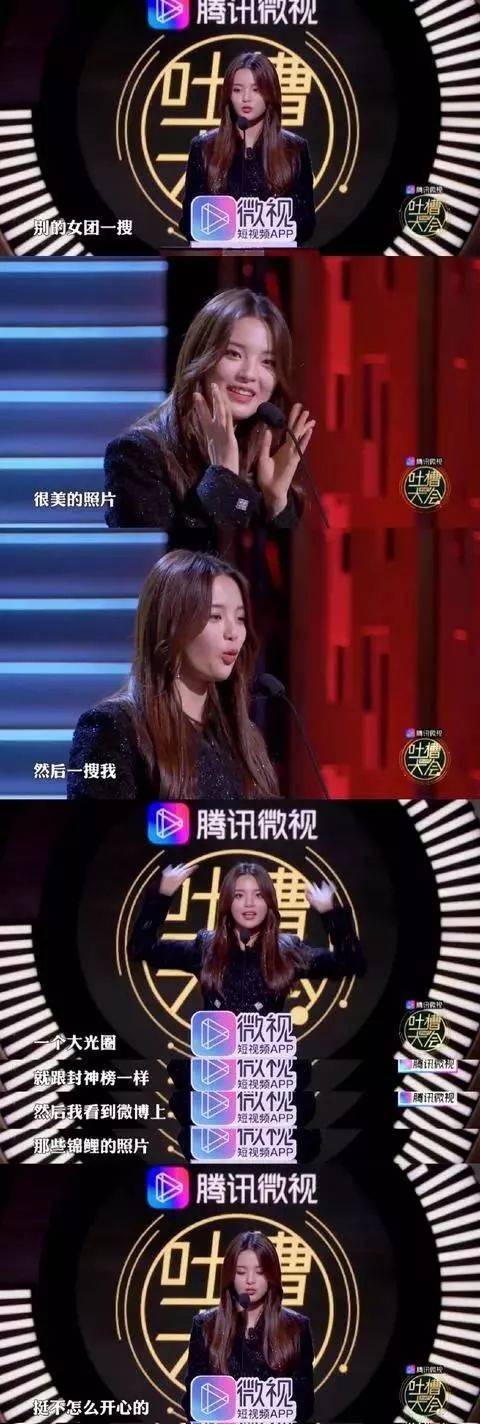 网上随处可见的锦鲤表情包,她本人似乎并不喜欢,因为“别的女团一搜都是很美的照片,一搜我,一个大光圈,就跟封神榜一样,我的心情是绝望的”,还封自己为"瑕疵担当”。