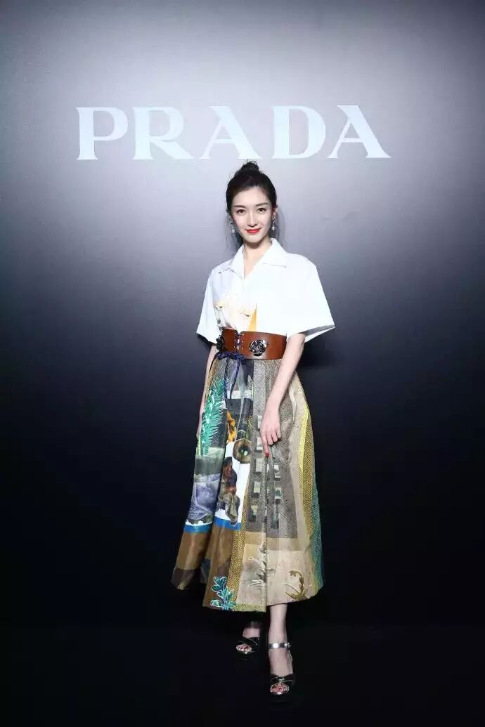 回顾江疏影的红毯礼服造型,印花衬衣及贴画印花半裙,搭配棕色皮革腰封及银色高跟凉鞋,上身白衬衣清爽搭配下装印花半身裙繁简得当。