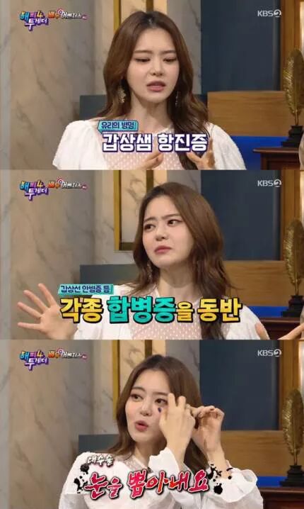 开个玩笑了,其实是因为之前徐宥利患有甲亢,所以服用了激素类药物,而这些药物造成了她眼球外凸,为了治疗甲状腺,她动了四次手术,而为了修复眼睛,她还接受了一个神奇的疗法。