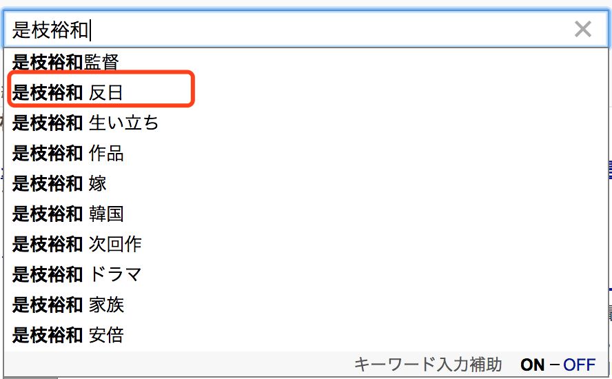 在雅虎日本搜索“是枝裕和”,在“是枝裕和导演”之后的关键词,就是“是枝裕和 反日”。