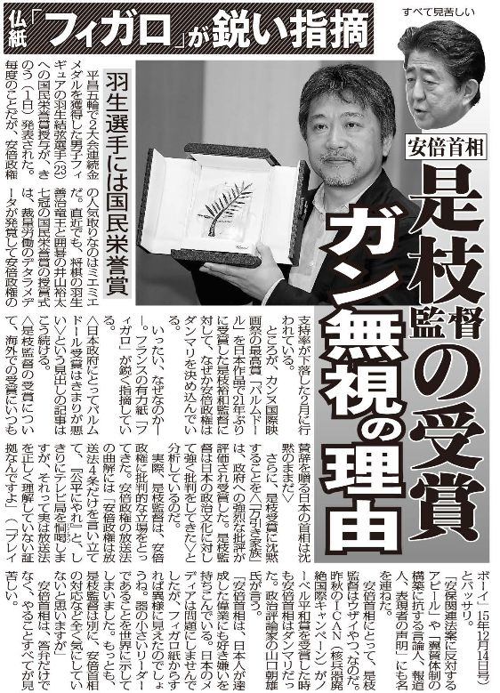 认可了是枝裕和艺术价值的是戛纳电影节,法国报纸自然也要身先士卒为这位日本导演打抱不平,“每当日本人拿到国际性奖项时必会送去赞词的安倍首相,这次一直保持沉默是为什么?”
