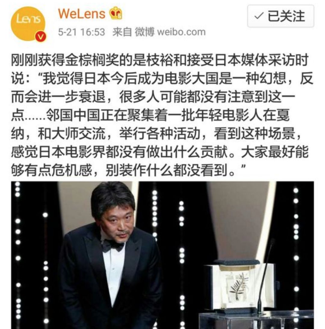 在两派的争论逐渐发酵之后,是枝在6月7日发文《关于‘祝意’》,表示目前他已拒绝包括政府在内的所有表彰,理由是“与公权力保持距离”。虽然此举又在日本被喷,是枝裕和在中国倒是引起一片叫好。