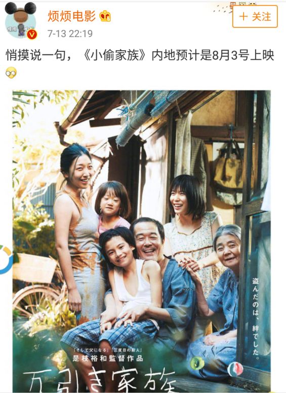 部屋君最期待的还是电影可以在全国公映,这部电影已经被国内影视公司买下版权,会在中国大陆上映,昨天部屋君看到有微博网友爆料,《小偷家族》将在8月3日上映,目前各个购票平台上显示,这部电影预计在8月份上映。