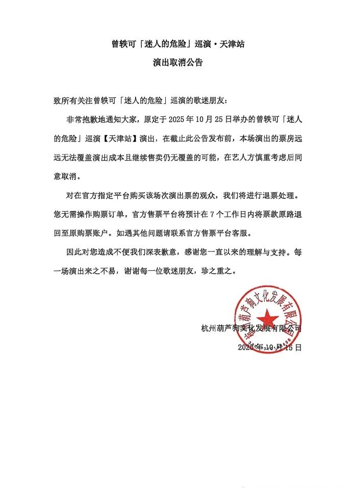 让不少天津歌迷的期待落了空——原定于10月25日举办的“迷人的危险”巡演天津站,正式宣布取消。