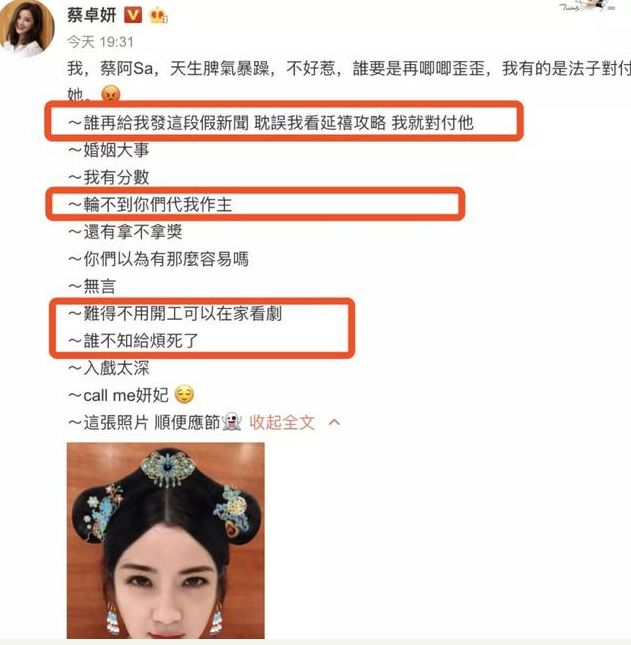 这本是件好事,然而蔡卓妍却在微博大发雷霆,还引用魏璎珞的话来怒斥造谣的人。