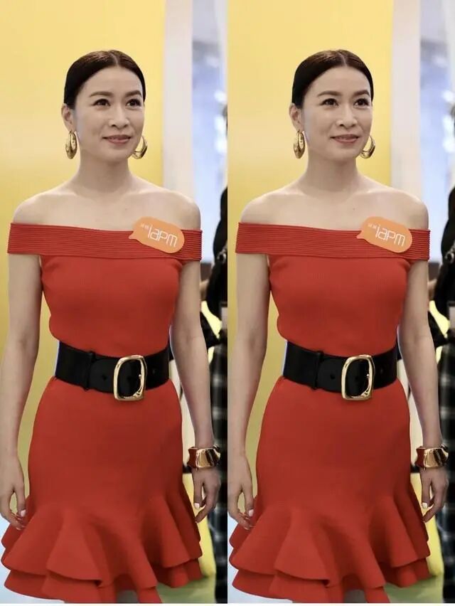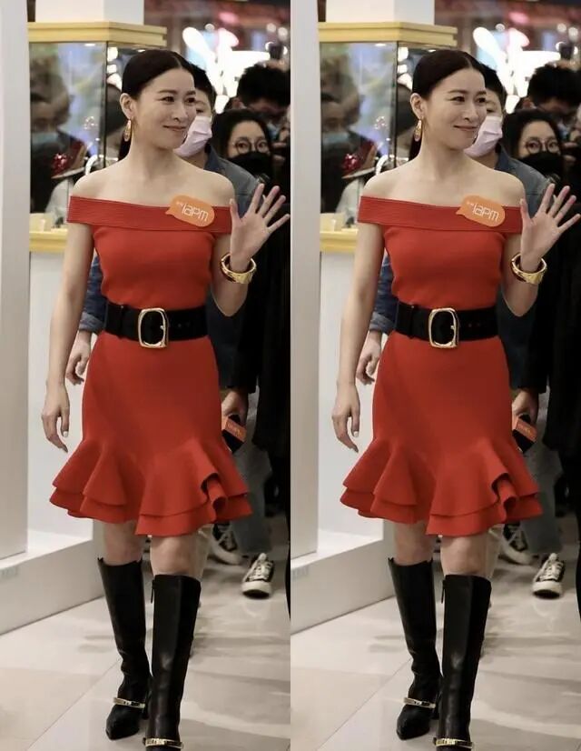香港女星佘诗曼出席活动的时候就穿着了一身红色针织收腰裙,搭配了一条黑色的宽腰带和黑色皮革长靴.