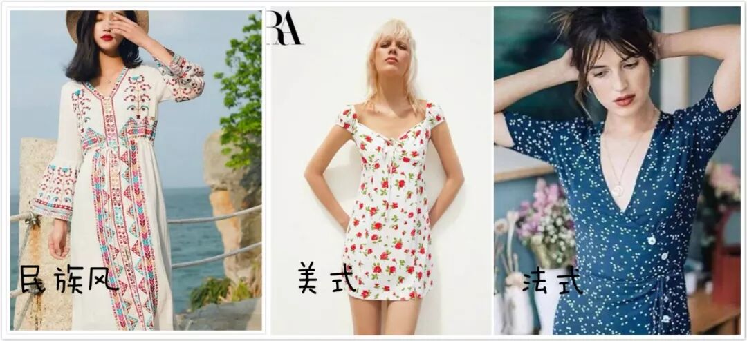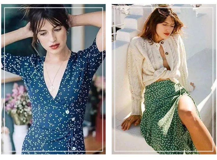 不同于民族风强的浓烈密集,也和美式的大碎花不同,法式连衣裙的碎花会比较小巧一点,而且和裙子的底色比较相近。