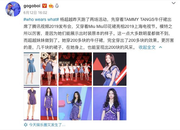 事情是这样的,超越妹妹有一次出席活动穿了MiuMiu的裙子,被宇博吐槽,“她穿200多块的牛仔裙,完全穿出了200多块的效果。更厉害的是,几千块的裙子,在她身上,也能呈现出200块的风采。”