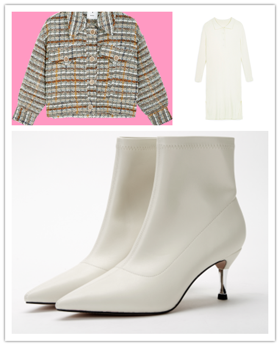 复古粗花呢夹克搭配气质小白裙,举止投足间满是优雅,女神指数Max。