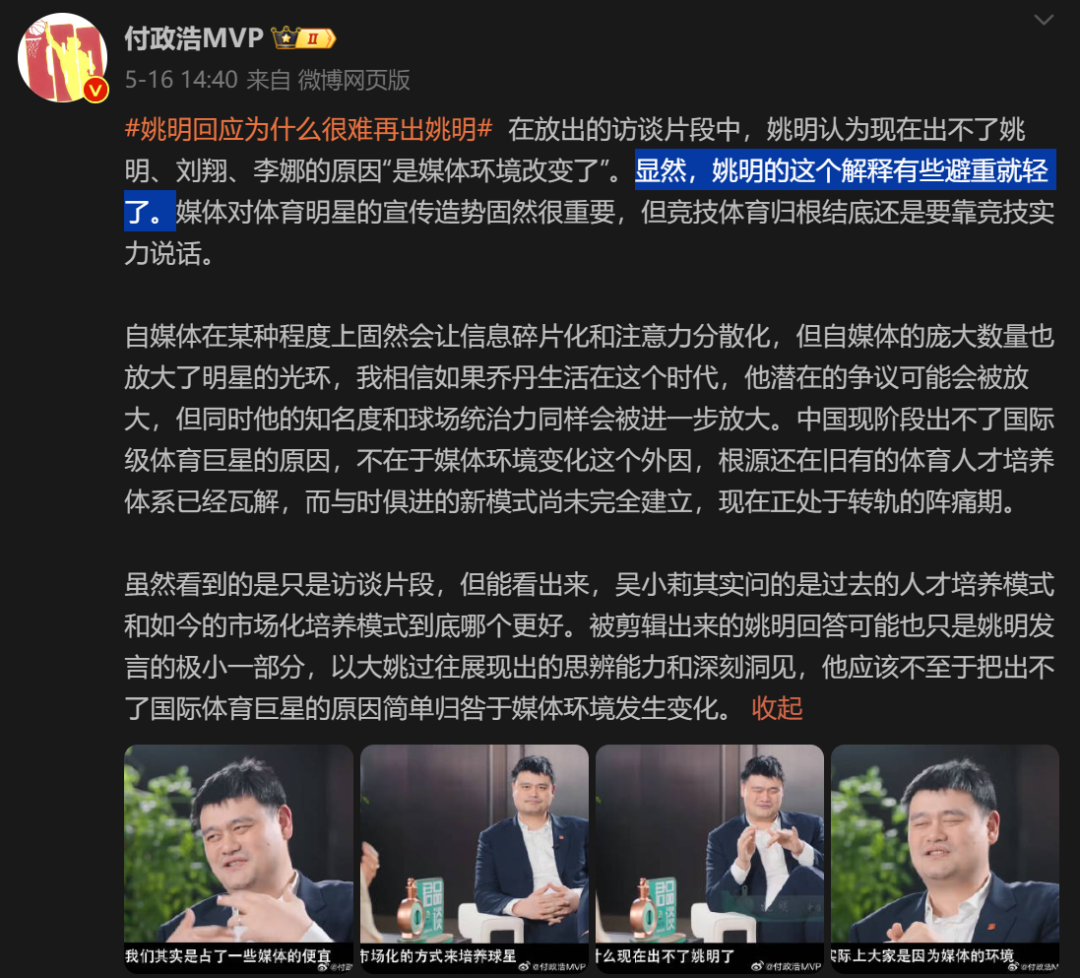 姚明答非所问,惨遭记者回怼 左右为篮 内地男星 2024-05-19 12:23:46 149 创作不易,用心坚持,欢迎请BaGua喝几杯爱心咖啡!打赏并支持本文 打赏并删除本文 近期,一则采访引起了很大的讨论热度。中国篮协主席姚明接受了知名记者吴小莉的采访,过程中,吴小莉问姚明为什么现在CBA联赛还能不能培养出从前哪种球星,姚明的回答有些顾左右而言他。姚明表示,因为媒体环境出了问题,由于自媒体的出现,导致大家可以选择自己喜欢的频道,去看篮球场上其他的东西,而不是真正喜欢一场比赛,只是碎片化的篮球片段。姚明还表示,他自己当年占了一些媒体的便宜,当年只有电视和报纸的报道。但这样的回答确实是很难令人感到满意。吴小莉还问,中国女篮最近出了很多明星球员,说是10年前种下的苗子,那么中国男篮现如今成绩不理想,是不是10年前做错了什么?姚明回答的是“(男篮)缺乏了与国际交流的机会,现在国际上的交流越来越频繁,竞争也越来越激烈”。这使得吴小莉直接回应“您还是迟疑了,没有真的回答我”。一时间,姚明也不知道如何回答,场面一度非常尴尬。实际上,采访一放出来,资深篮球媒体人付政浩也不同意姚明的说法,甚至公开发文驳斥。所以,姚明能不能正面回答问题呢?中国男篮和中国女篮的国际交流机会不对等吗?中国男篮的低迷是因为媒体环境不好吗? 创作不易,用心坚持,欢迎请BaGua喝几杯爱心咖啡!打赏并支持本文 打赏并删除本文 感谢您的支持鼓励,我会继续努力的!文章地址:用户邮箱:打赏金额:USDT 请输入数字点击”去打赏“,即可进行打赏支持本文章哦 姚明 发表评论