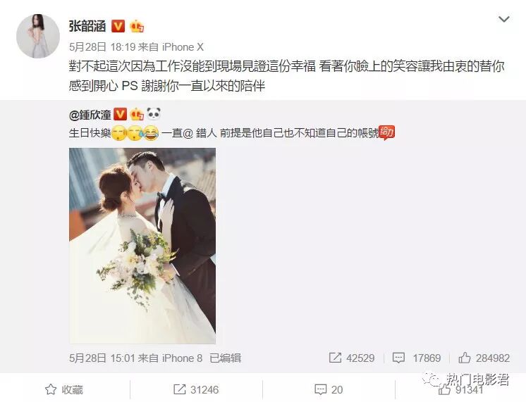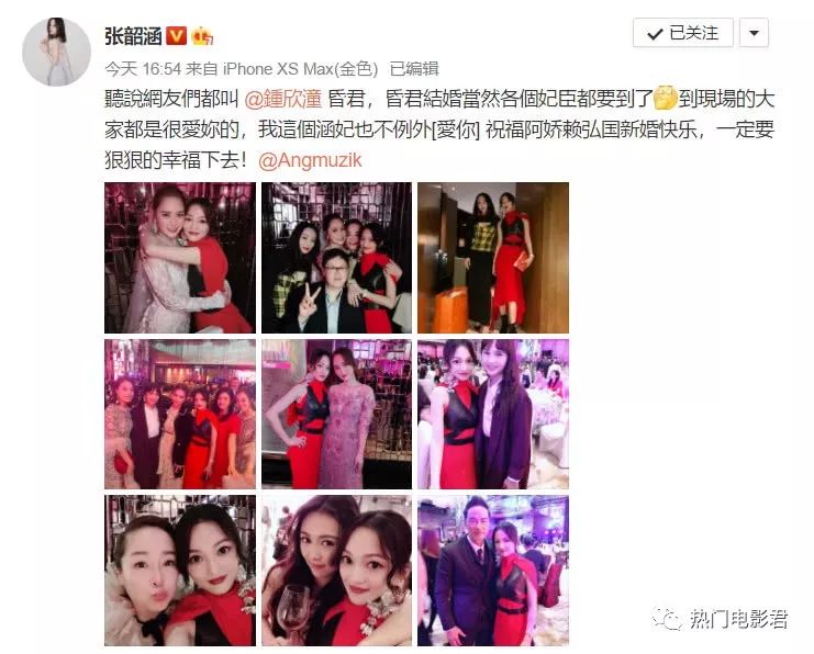 最近钟欣潼与赖弘国大婚,圈内好友纷纷赶来祝贺,闺蜜团容祖儿、张韶涵等人当然也纷纷出席,不过在婚礼上与阿娇关系非常要好的张韶涵却没能成为伴娘团一员,事后张韶涵在发布动态恭喜阿娇新婚大喜时,也不忘调侃好闺蜜称她是“昏君”,同时还自称涵妃。虽然没有成为阿娇的伴娘,但张韶涵依然送上真挚祝福“到现场的朋友们都是爱你的,我这个涵妃也不例外,一定要幸福下去。”