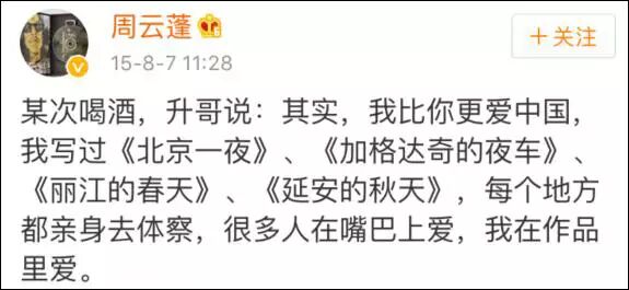 民谣歌手周云蓬也曾发微博,表示陈升说过,“我比你更爱中国”。