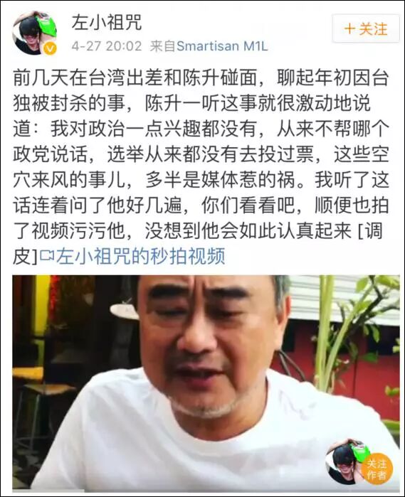 4月27日晚,@左小祖咒 在微博上传了一条视频。视频里,台湾歌手陈升一再强调:“我不是台独。”