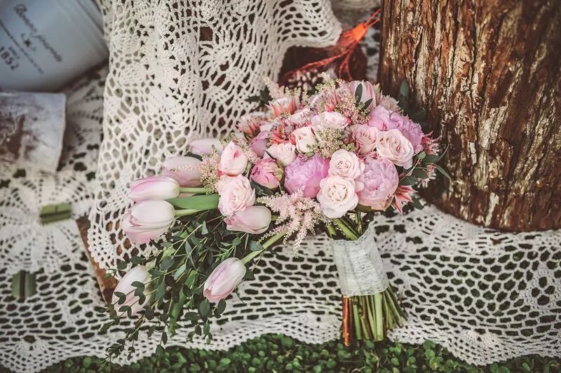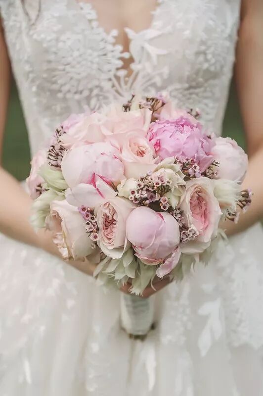 依旧是少女心的粉白,选择了大盏大盏的粉色芍药,晚上的仪式花,则选择了水滴型。都是要求以蕾丝装饰。