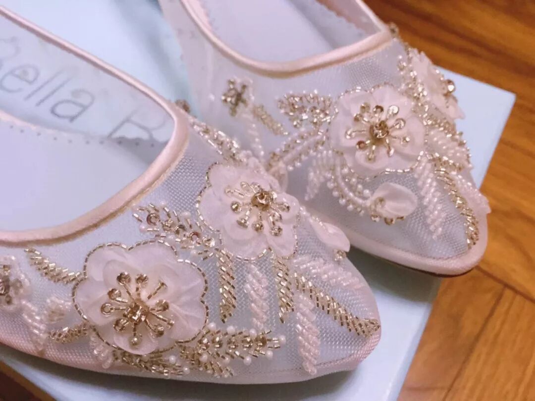 我没穿过几次高跟鞋,不太会穿高跟鞋走路,也担心一米七五的本人踩上高跟后和先生持平身高,以及户外草坪仪式种种原因,又种草了一双 bella belle 的平底鞋。(国内没有门店,可官网)强烈推荐这个品牌的婚鞋,超级仙,性价比也很高。这双300刀左右购入。