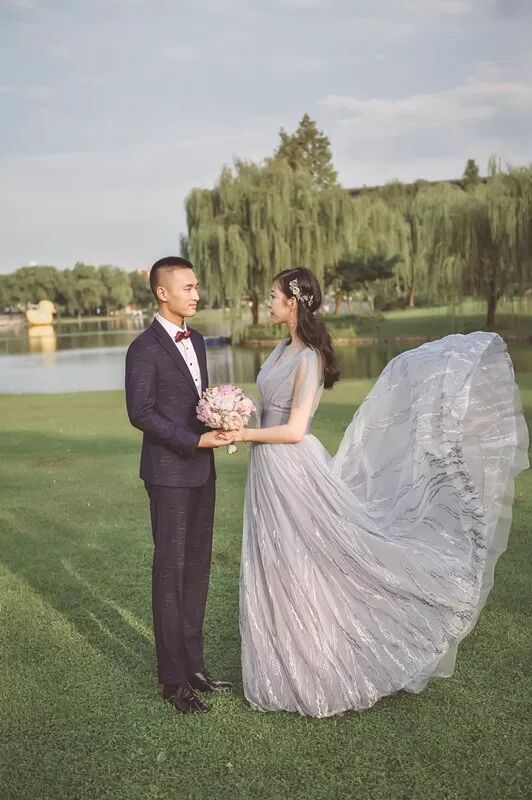 婚礼当天的礼服,大约有早上的出门纱(现在很流行穿中式秀禾或叫龙凤褂)、主纱、感恩服、敬酒服。如果有室外,也可以考虑多一套草坪仪式的礼裙。