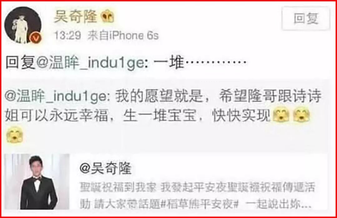 吴奇隆与刘诗诗婚后似乎也验证了这个说法,因为夫妻两人每次被问到为何不生孩子时总会说:不着急,时间还很长。吴奇隆也经常被粉丝们催生,对此他也回应道:会生一堆!