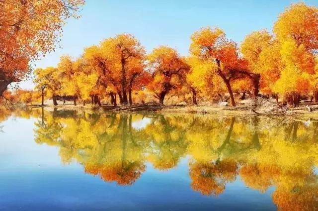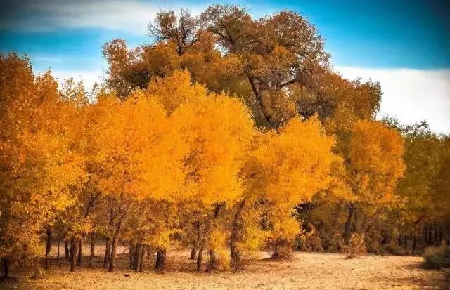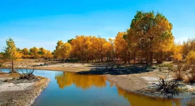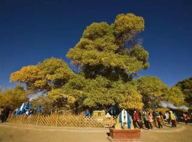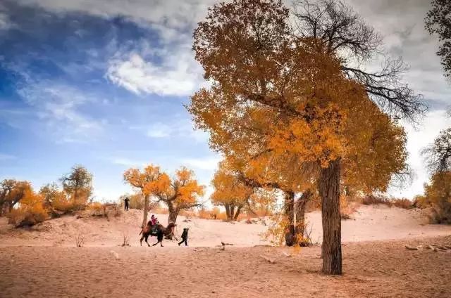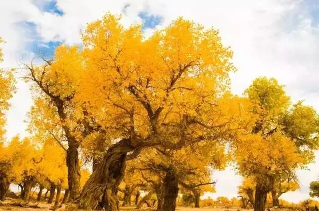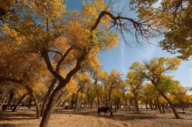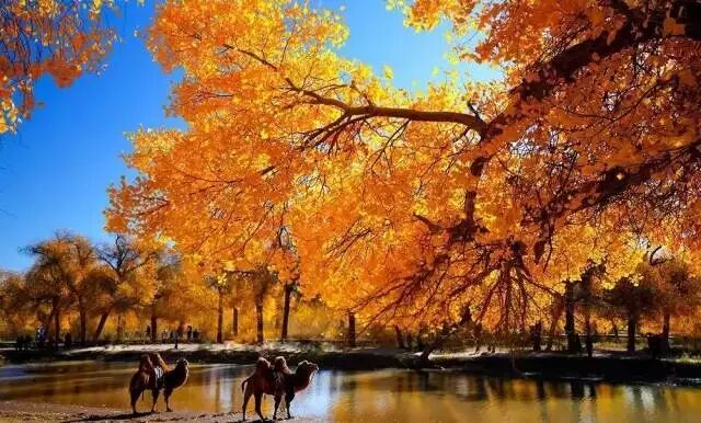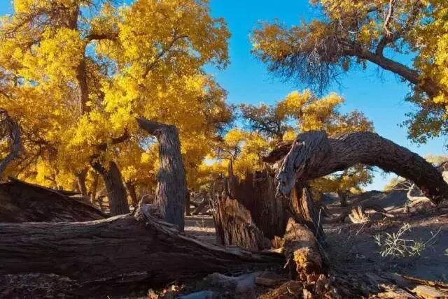 每当10月初胡杨的树叶全部变黄时,湛蓝的天空下,金色的胡杨林海就犹如灿烂的太阳照亮了整个额济纳。