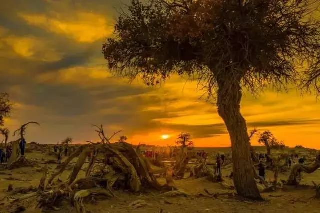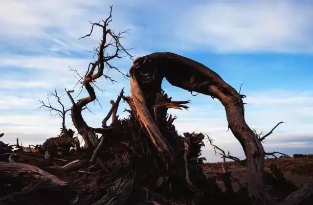 它们或挺胸、或匍匐、或仰天长啸、或悲天悯人、屹立在沙漠,不肯倒下,犹如一群战死到最后的战士,悲壮苍凉,当地人称其为“怪树林”。