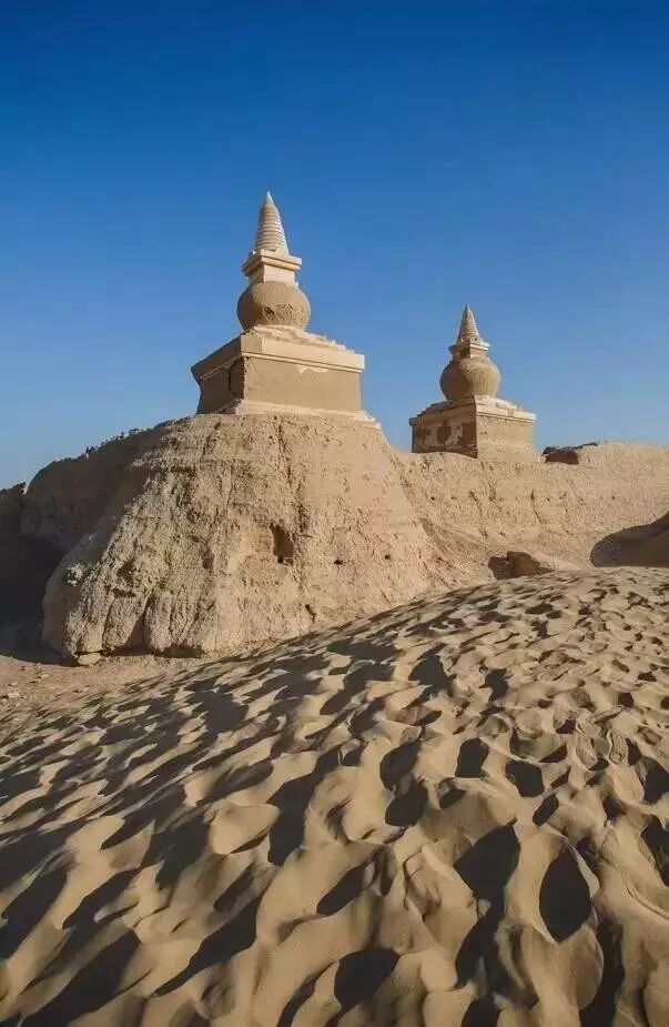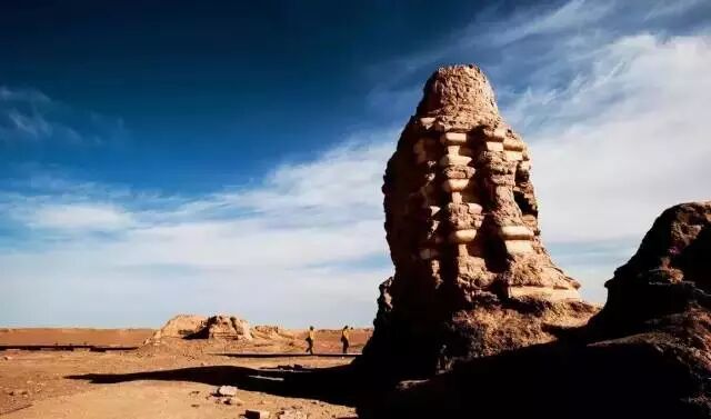 西北角城墙上有一座覆钵式塔,远在10公里以外的荒漠上就可看到。城外临近大土塔不远的地方还有两组土塔群,但仅残留塔基,整座遗址给人无限苍凉、悲壮的感觉。