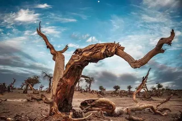 但并不是每一颗胡杨都能像“神树”那样长寿,它们大多数都要在岁月的轮转中渐渐枯萎,死后千年不朽的胡杨林以千姿百态的形状,透出一股恐怖又令人心醉的气息。