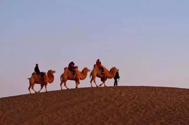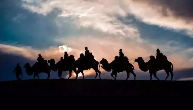 夕阳西下时,驼队的剪影倒映在黄沙上,仿佛又回到千百年前的时光。