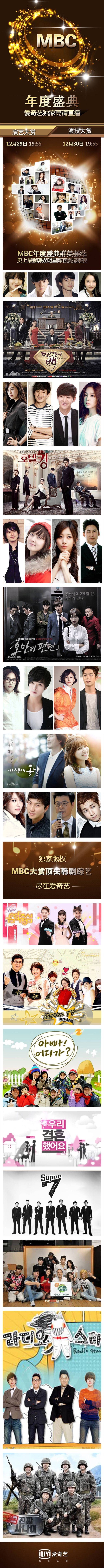 2014韩国 MBC演艺大赏将在12月29日北京时间19:55登录爱奇艺。《爸爸!我们去哪儿》主持人金成柱,将首次搭档主金成玲、朴炯植等综艺主持人同台主持。《我们结婚了》、《真正的男人》等热播综艺主创南宫民、洪真英、宋再临、金素恩、洪宗玄、Yura 、Henry、朴建炯等将悉数出席。《我独自生活》《无限挑战》《我们结婚了第四季》《爸爸!我们去哪儿?》《真正的男人》《黄金渔场Radio star》等爱奇艺高收视独播综艺,均已入围 2014MBC演艺大赏。