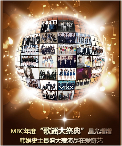 12月31日MBC 歌谣大祭典,将于当晚北京时间19:55上线爱奇艺直播。金成柱、全炫茂、 “国民恶女”李宥利、SISTAR成员昭宥、Girl’s Day成员惠利将共同主持。东方神起、EXO、少女时代、CNBLUE、Ailee、Infinite、泰民、太珍儿、2PM、4minute、AOA、Girls Day、GOT7、Kara等41组、170多名歌手将以对决的形式进行表演。