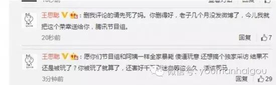 有网友晒出评论截图,王思聪曾指责代打事件:“愿你们节目组和阿姨一样全家暴毙。”