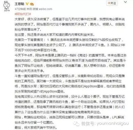 在阿怡道歉和英雄联盟处罚结果公布前,6月8日,国民老公王思聪也连发微博,怒斥阿怡和腾讯节目组。