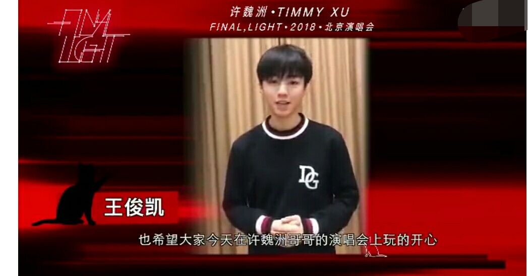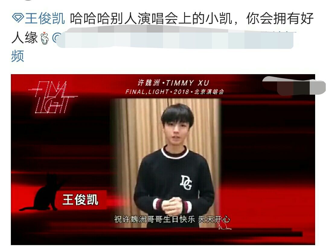 王俊凯说:“祝福许魏洲哥哥生日快乐,天天开心,也希望大家能够在今天许魏洲哥哥演唱会上玩得开心,祝演唱会顺利”。