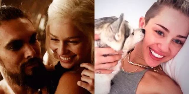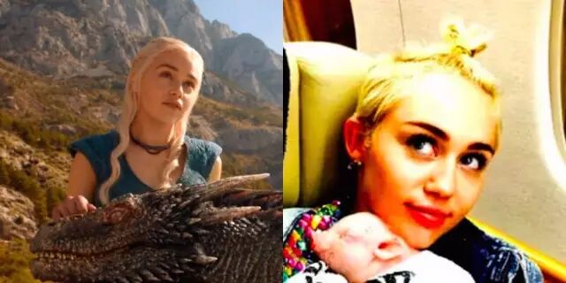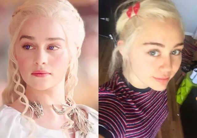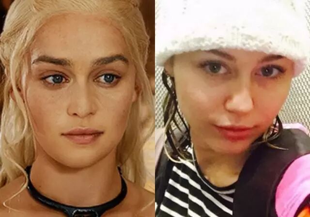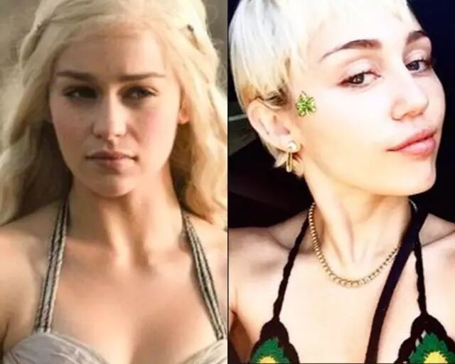 那就是麦粒Miley Cyrus竟然和《权利的游戏》里的龙母撞脸啦!两个人都梳着小辫子,完全就是一模一样啊▼